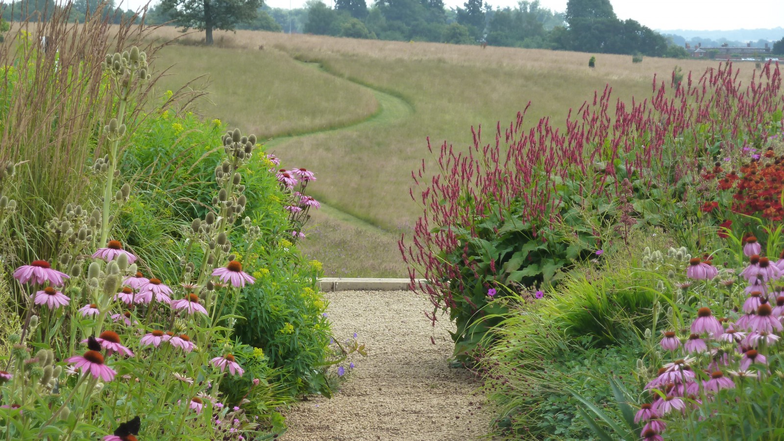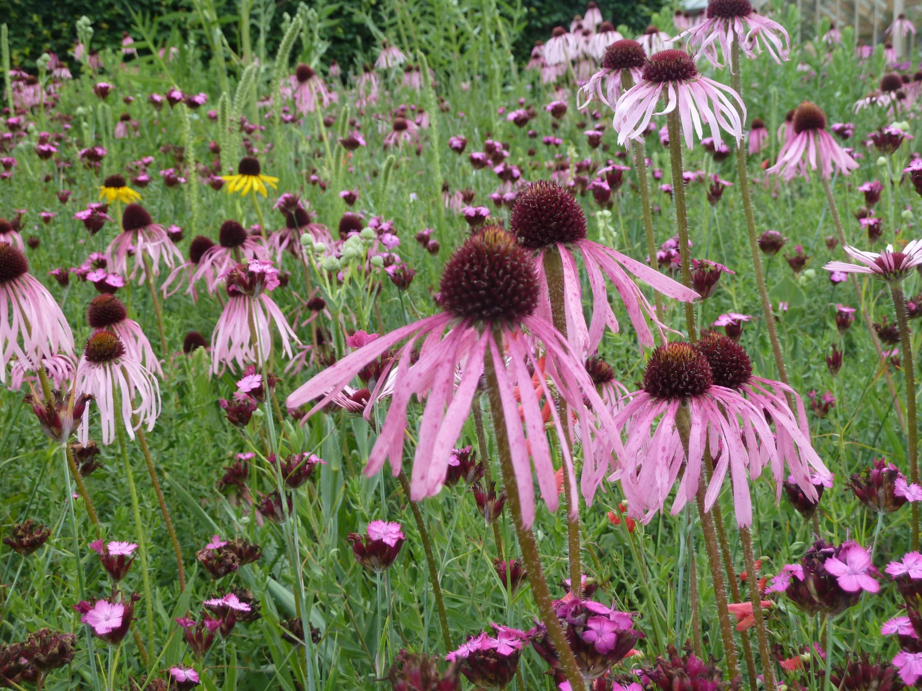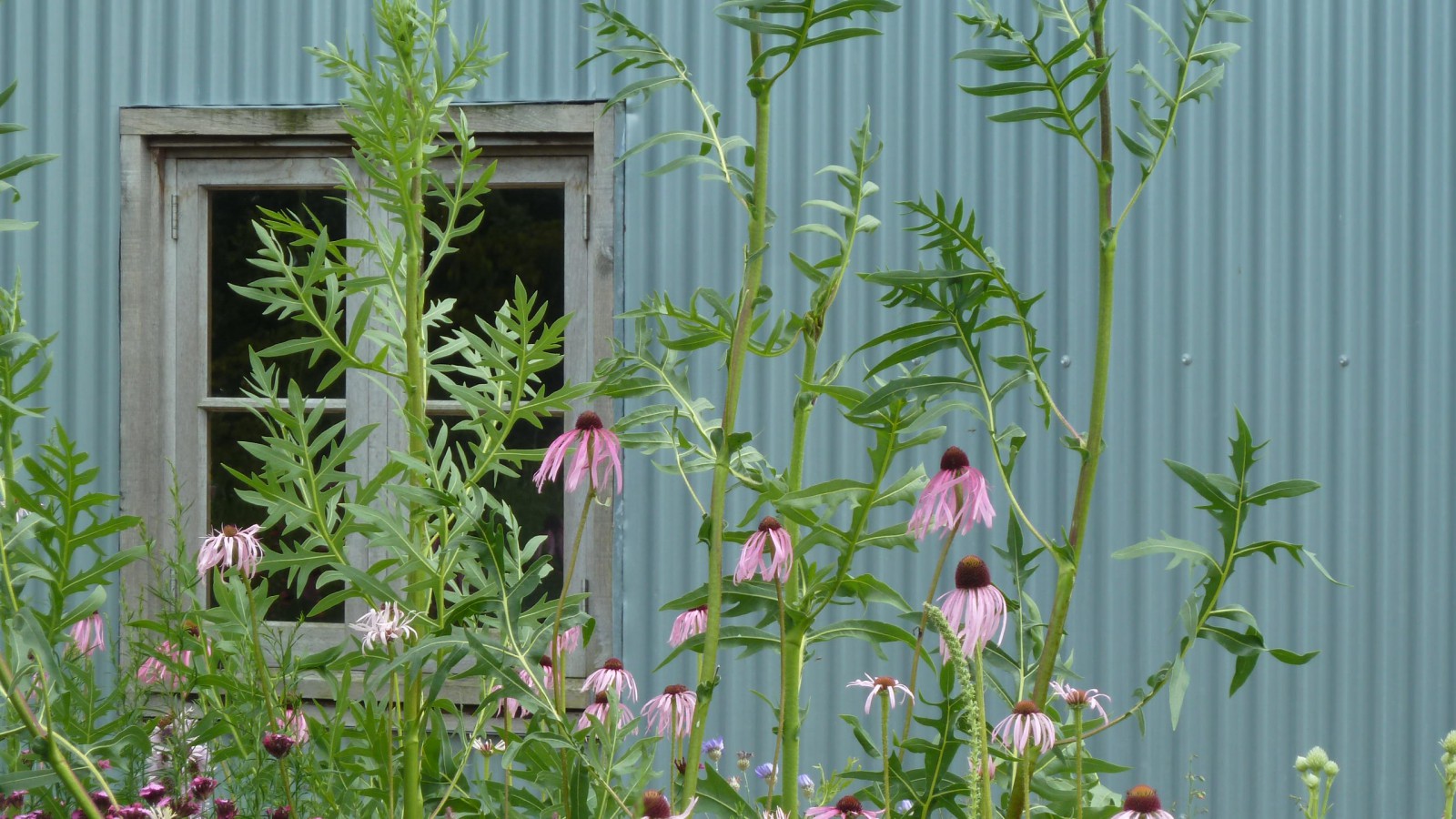 The first area I came across at the Barn garden was the perennial meadow next to the vegetable garden. The Echinaceas (pallida, paradoxa & purpurea) looked stunning, and I couldn’t help noticing how they harmonised with the grey-blue walls of the near-by building and the aged silvery timber window frame, a carefully considered design detail. This meadow will only get better as the season progresses, so worth revisiting in September.